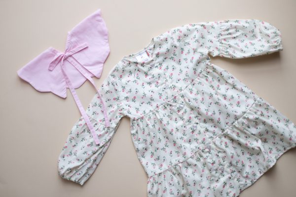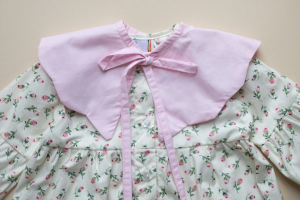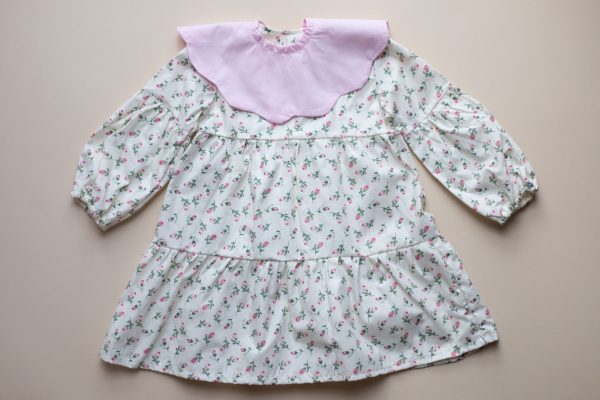 Rochia Liana este realizată dintr-un bumbac cu imprimeu floral și este accesorizata cu un guler detașabil roz pal.