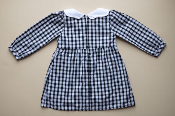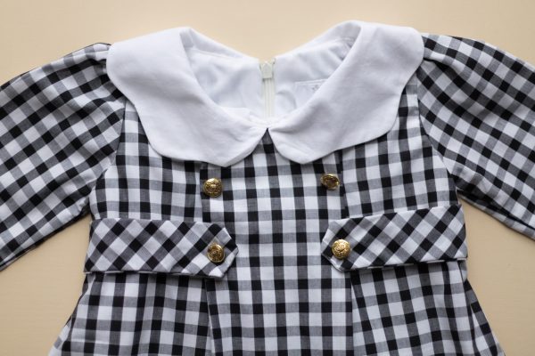 Rochia Mady este realizata dintr-un bumbac in carouri, accesorizata cu nasturei aurii din partea din fata si un guler tip floare.