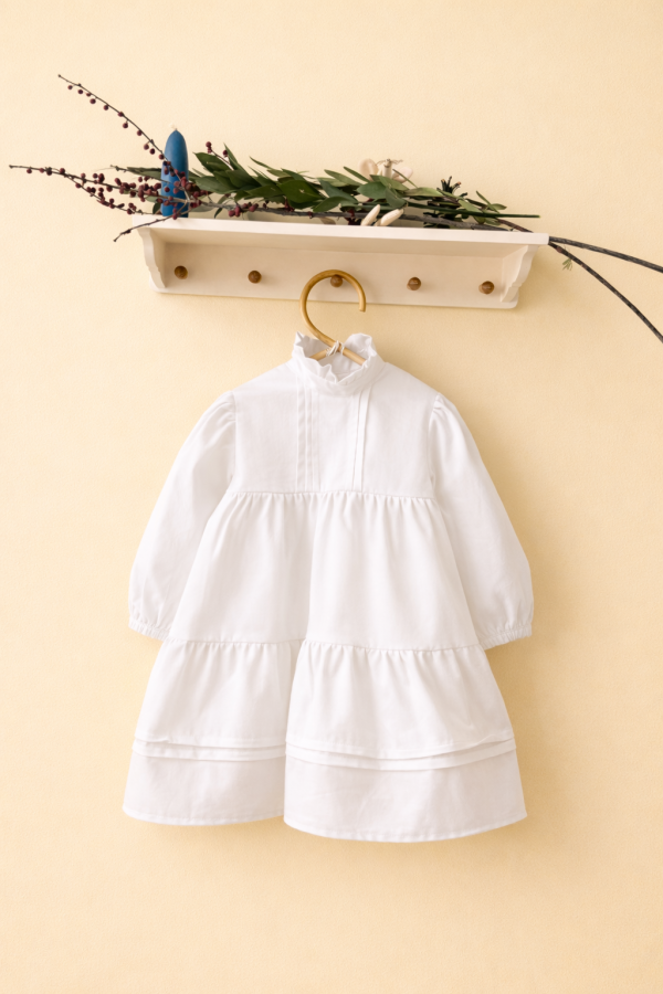 Rochia Merry este realizata dintr-un bumbac alb, plin, inchiderea se realizeaza la spate in fermoar ascuns si un nasturel tip perla.