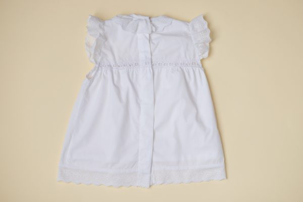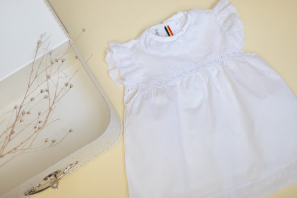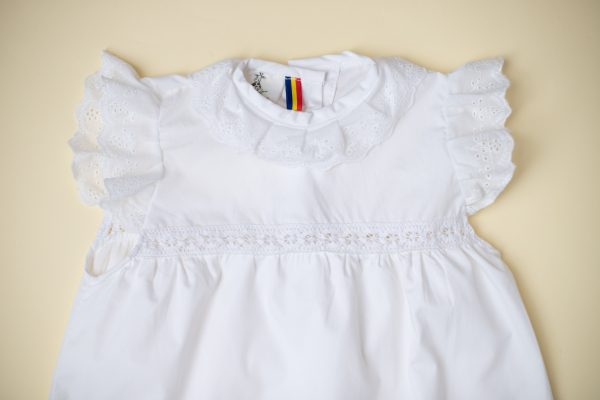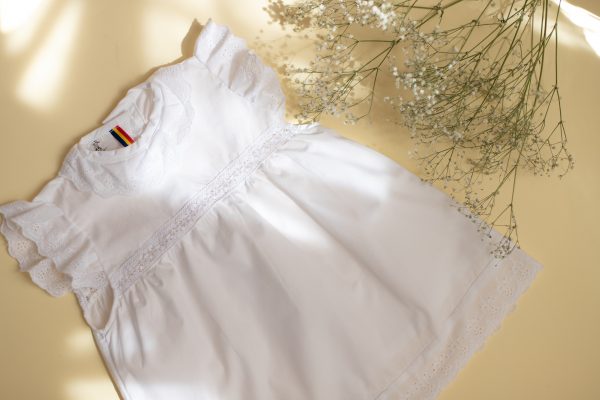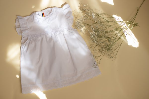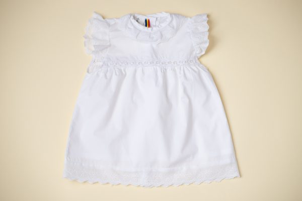 Rochia Mia realizata dintr-un bumbac alb, captusita, in combinatie cu doua tipuri de broderie, este ideala pentru evenimentele importante din viata micutei voastre.
