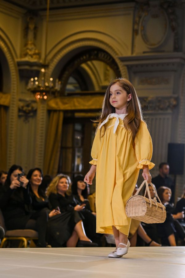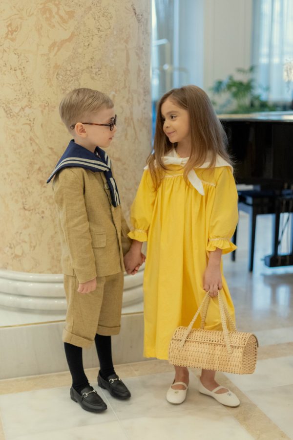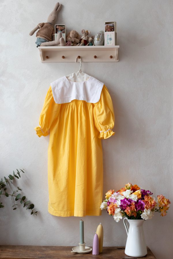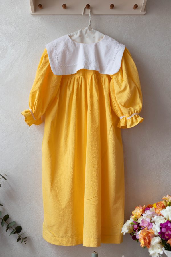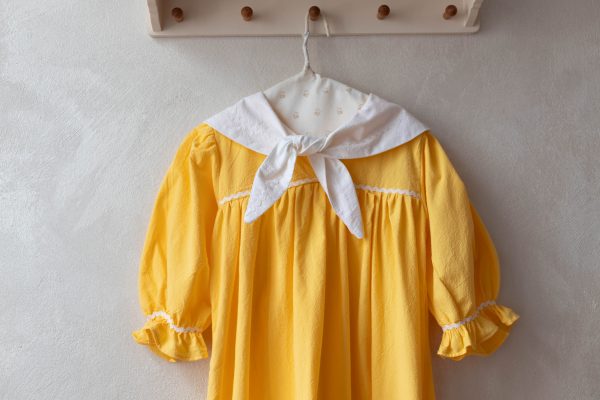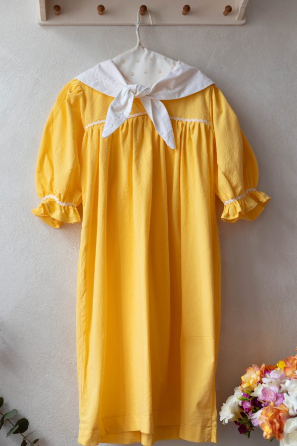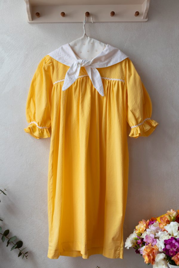 Rochia Milly este realizata dintr-o panza din bumbac galben soare, accesorizata cu un guler marinaresc si o broderie alba in zig-zag.