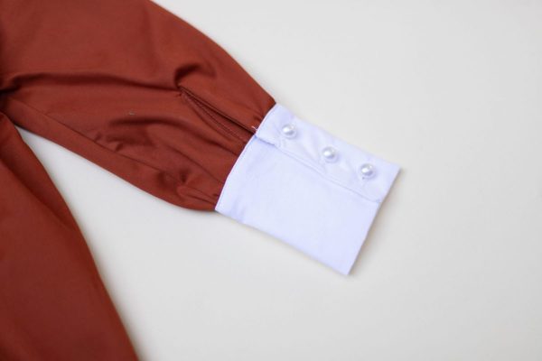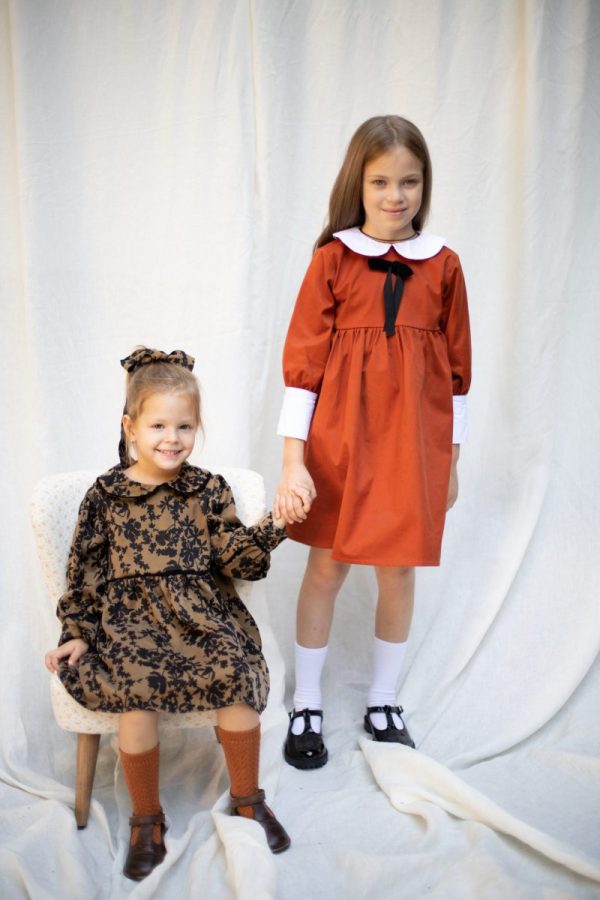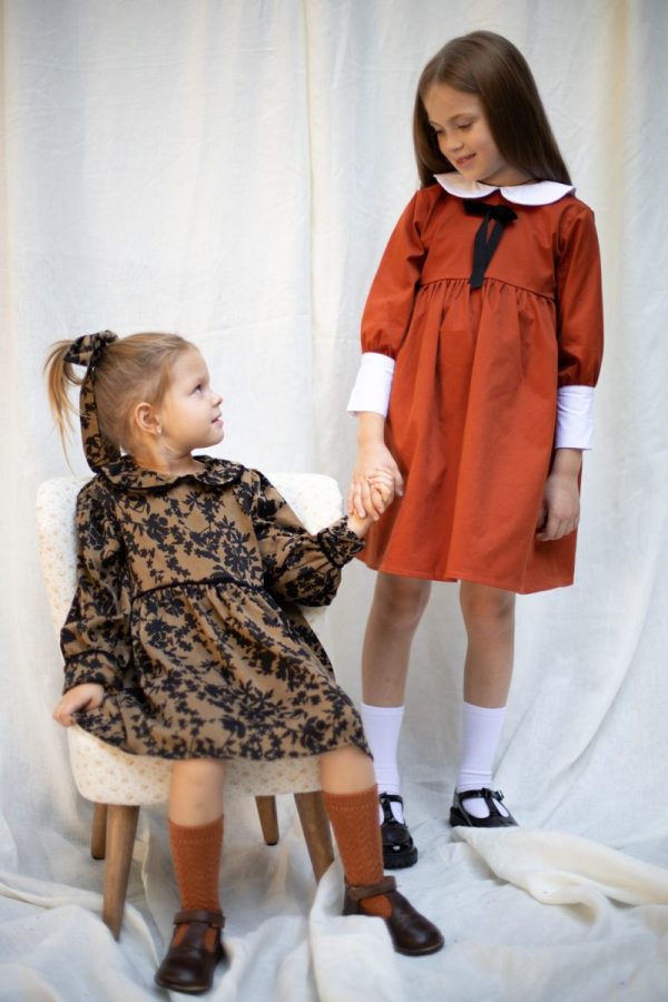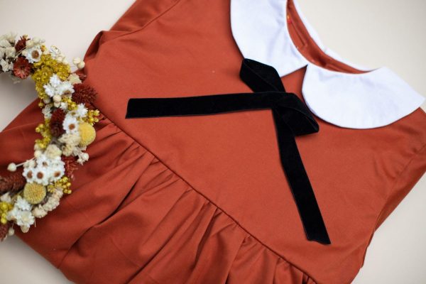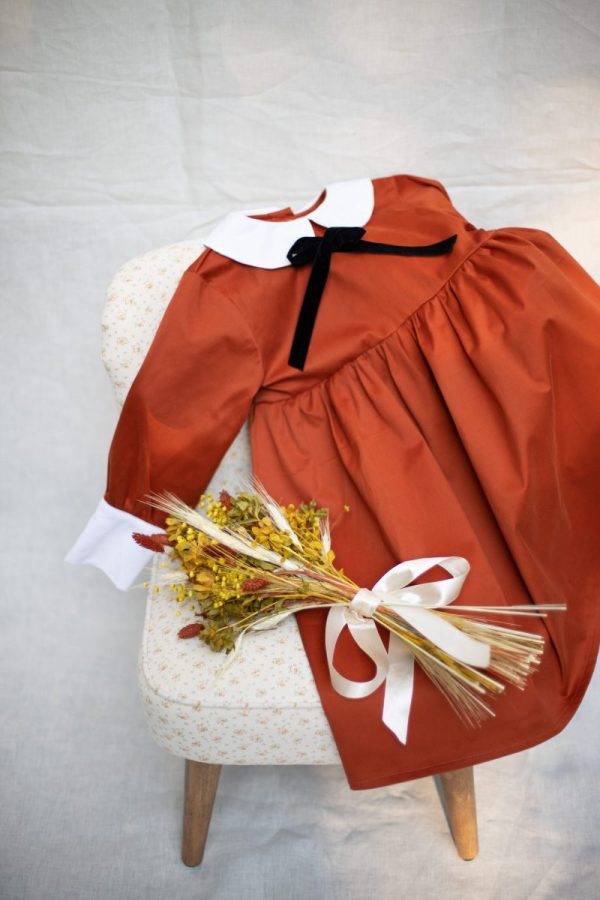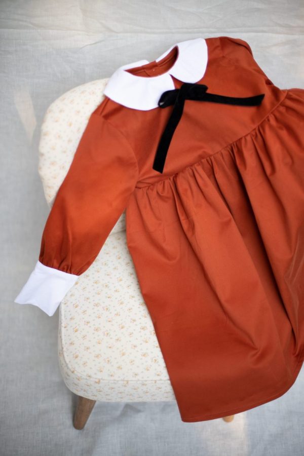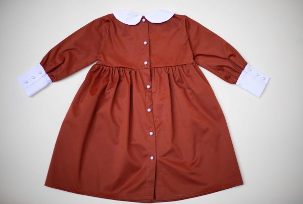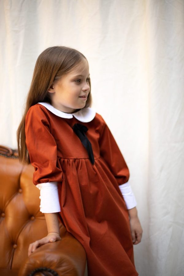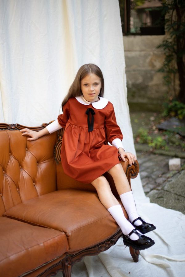 Rochia Nathalie din bumbac plin, moale, cu tus catifelat, culoarea maro caramiziu, accesorizata cu un guler din bumbac alb si manseta inalta, nasturei tip perla si un fundita din catifea neagra in fata, este ideala pentru toamna-iarna.