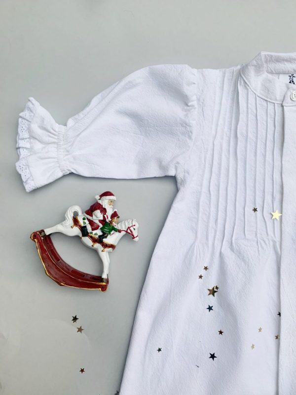 Cu un guler tip tunica, nasturei ascunsi si broderie la manecuta, ea poate fi purtata de fetite sau de baietei la evenimentele Catolice.