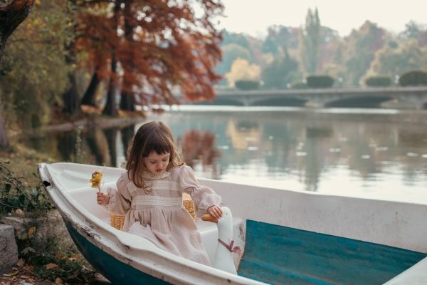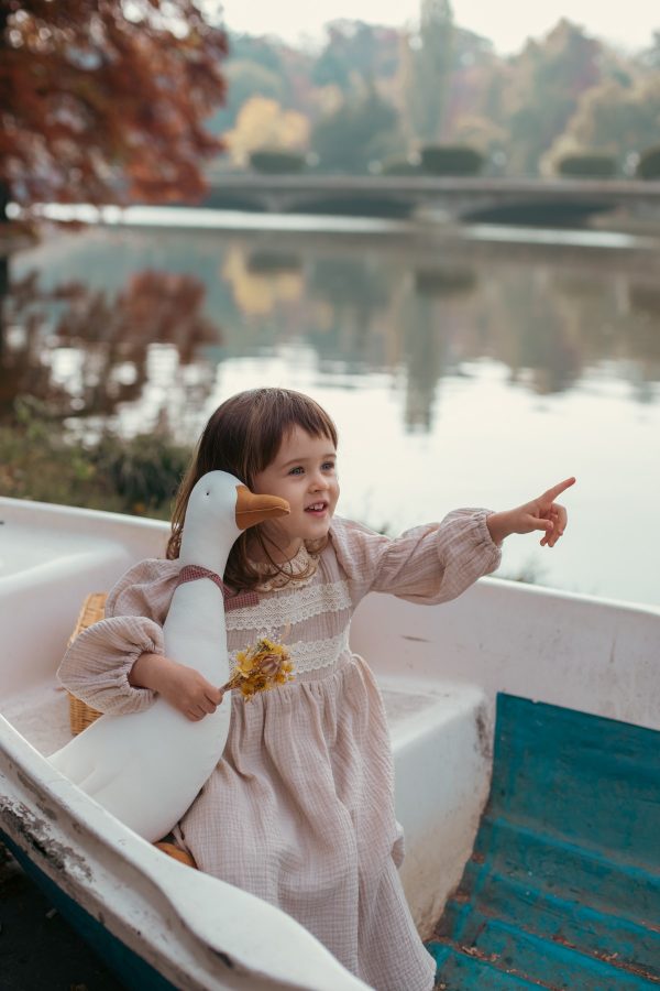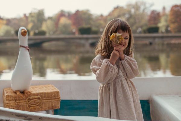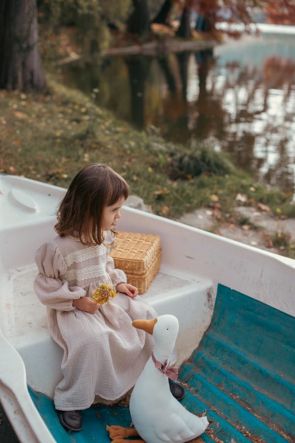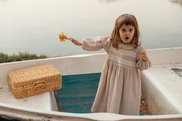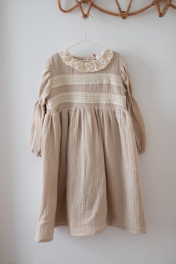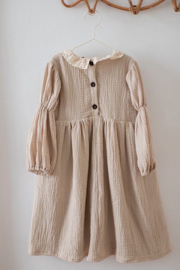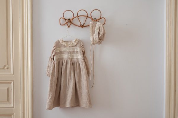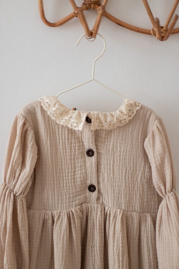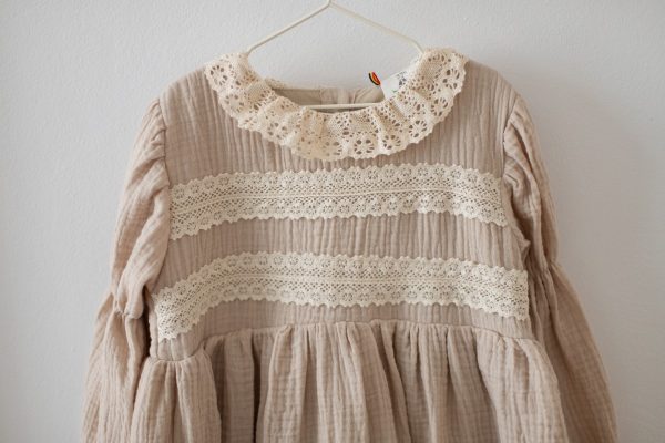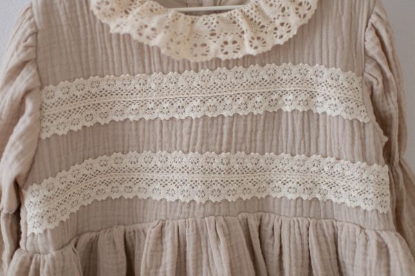 Rochia Vivien este realizata dintr-o muselina organica bej, accesorizata cu o maneca bufanta si o broderie din bumbac natural bej deschis.