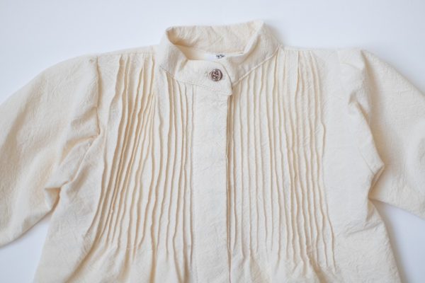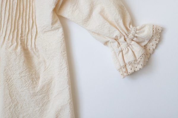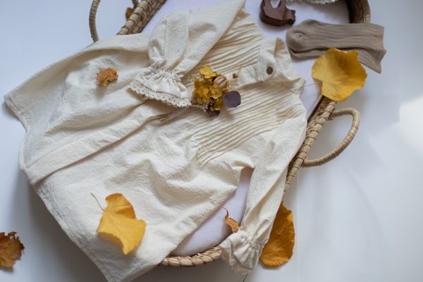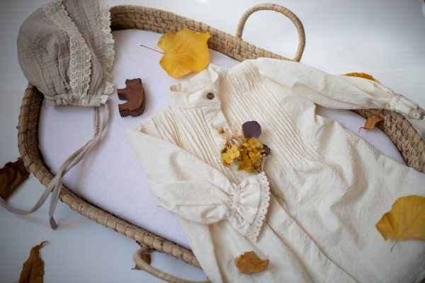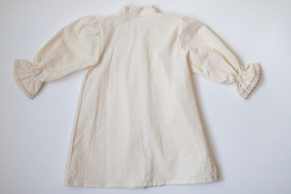 Rochia Zina este realizata dintr-o panza din bumbac natur, accesorizata cu un guler rotund si o broderie din bumbac natur.