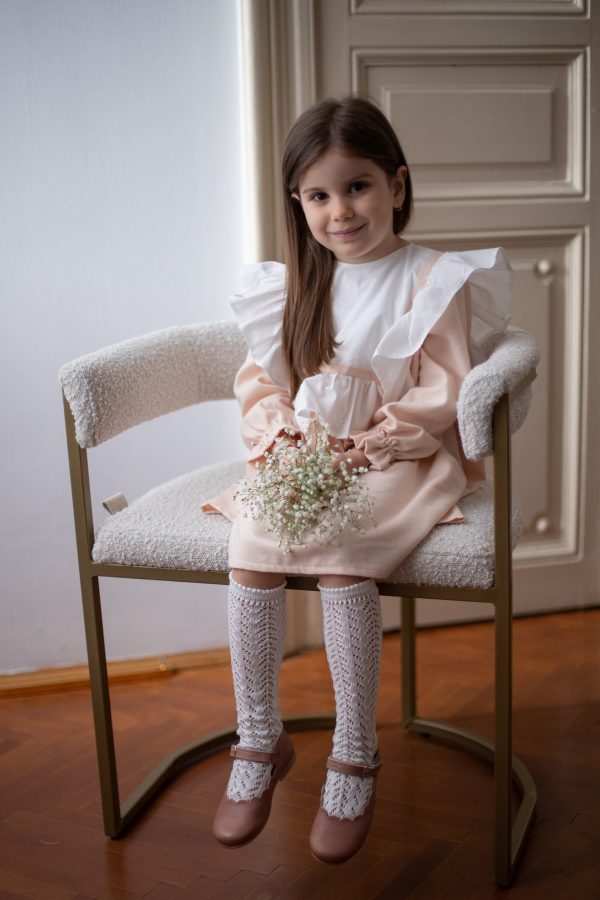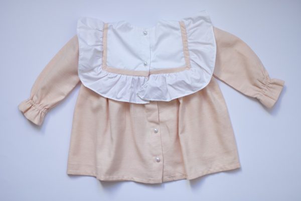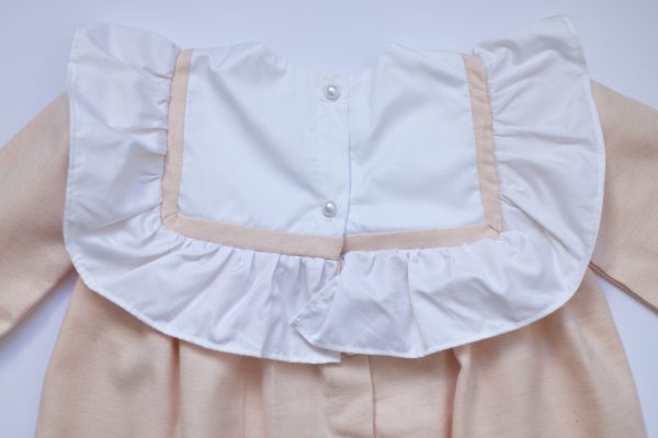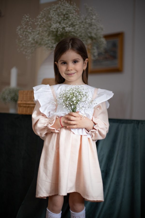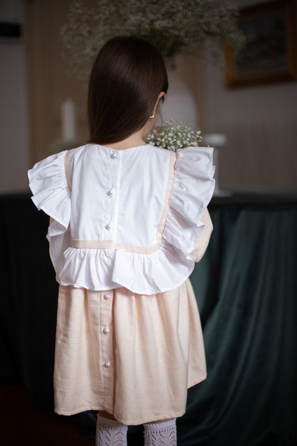 Rochita Gloria este realizata dintr-o stofa de lana piersiciu pal, accesorizata cu volanase din bumbac alb in partea din fata si la spate.