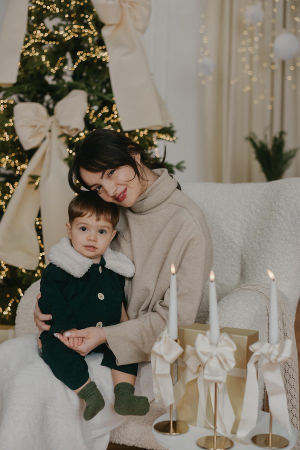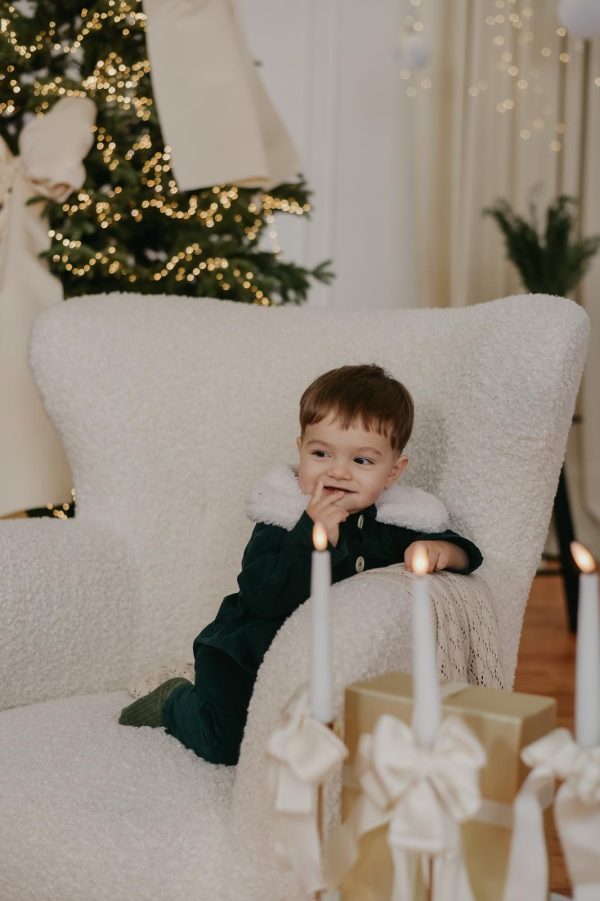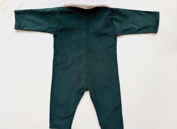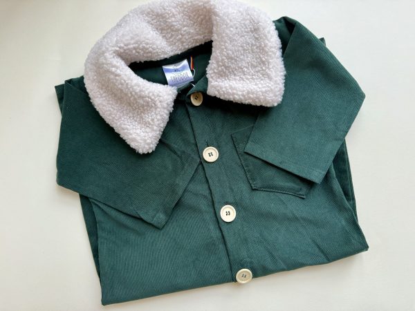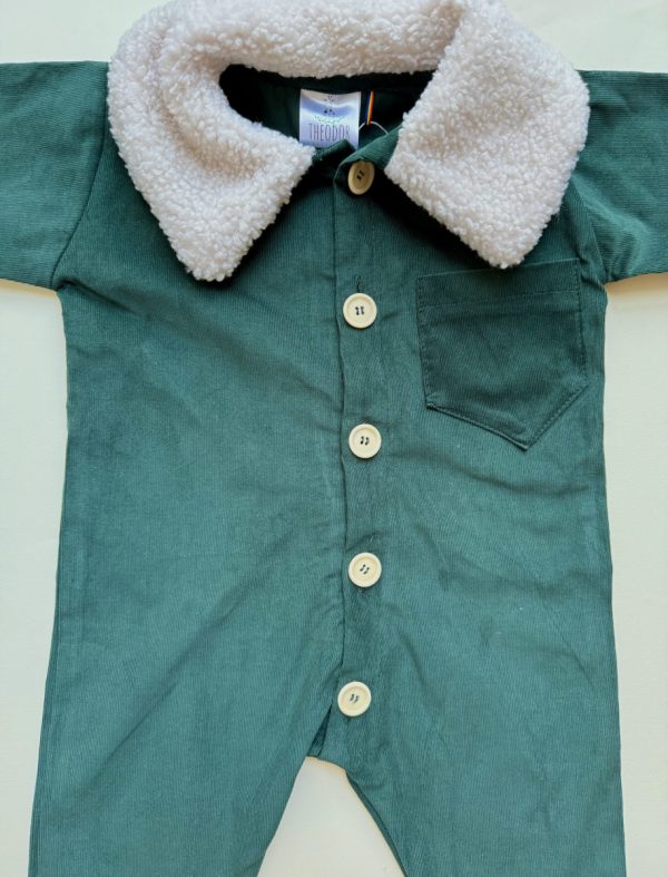 Salopeta Achim este realizata dintr-un velur din raiat verde inchis, bumbac natural 100%, accesorizata cu un guler din blana alba.