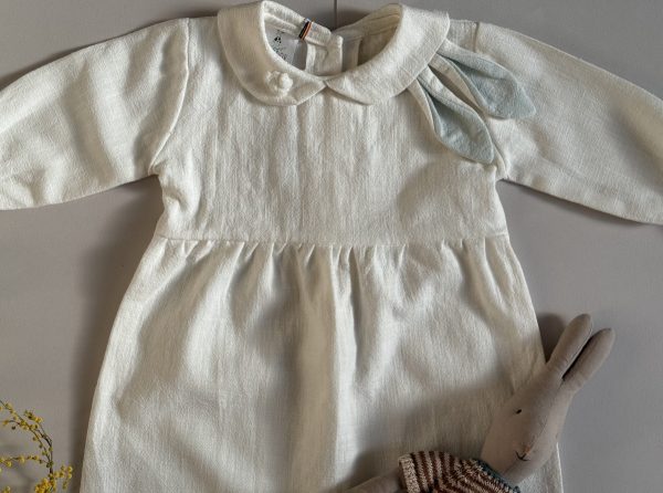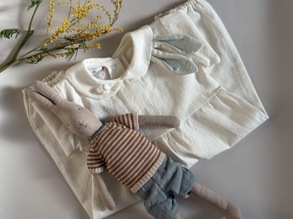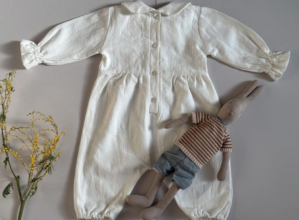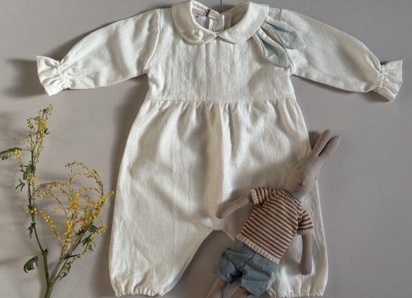 Salopeta Bunny din in prespalat ivory este un model unisex, ideal atat pentru fetite cat si pentru baietei.