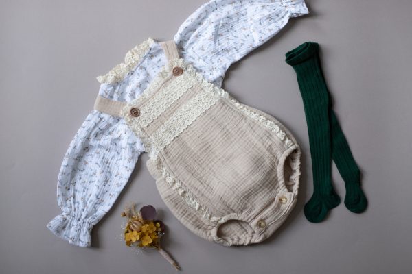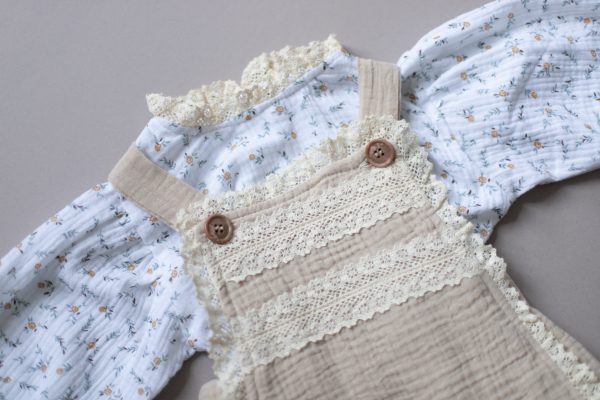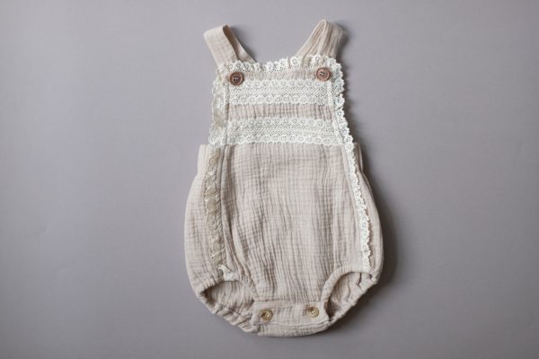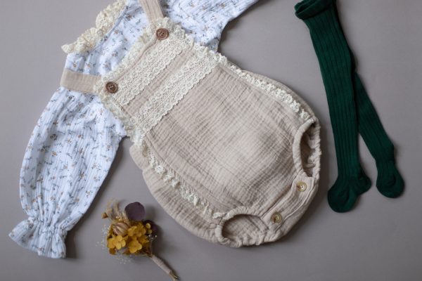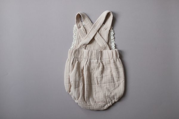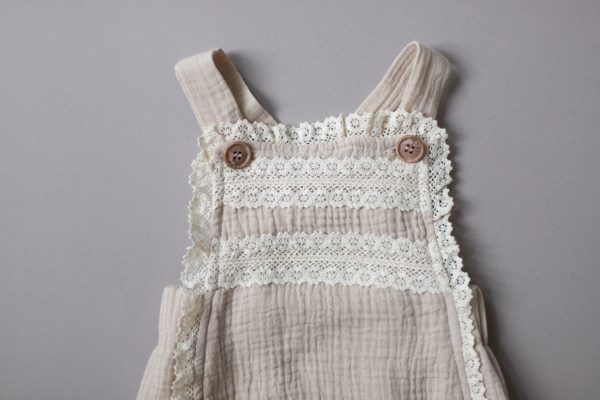 Salopeta Charline este realizata dintr-o muselina organica bej, dublata la interior cu aceeasi muselina si accesorizata in partea din fata cu o broderie din bumbac natural.
