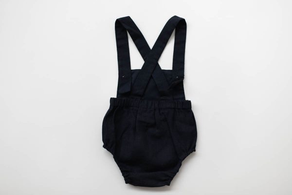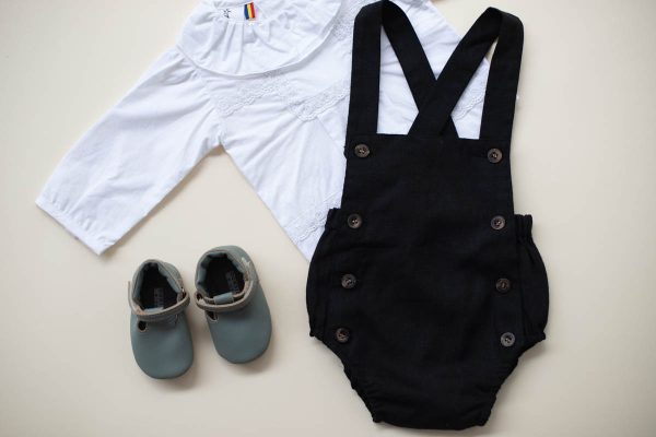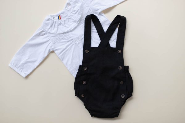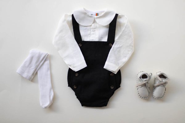 Salopeta Dimitri din in negru este un model unisex. Poate fi accesorizata cu o camasuta alba cu broderie ingusta, sau un body alb.