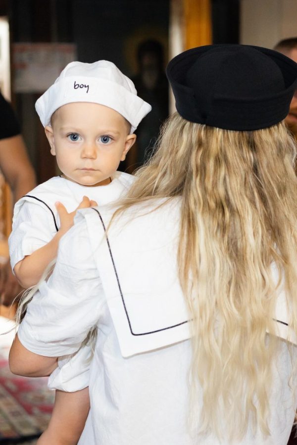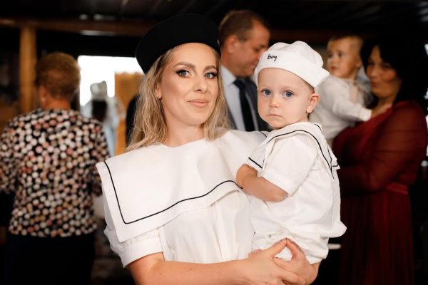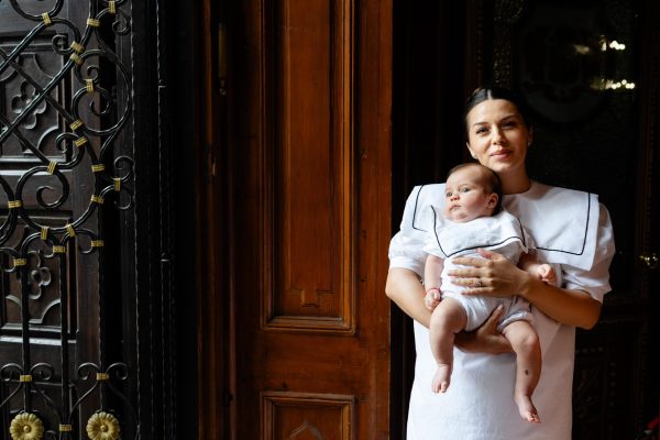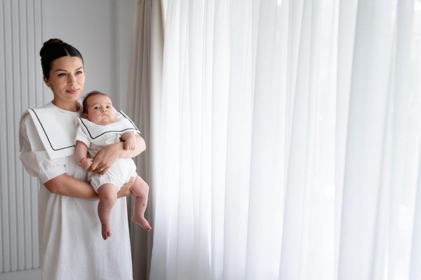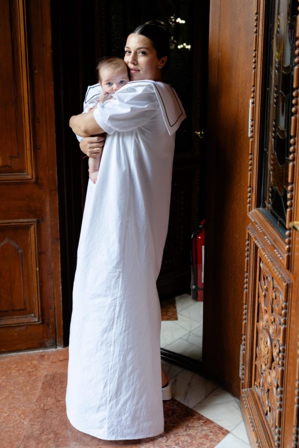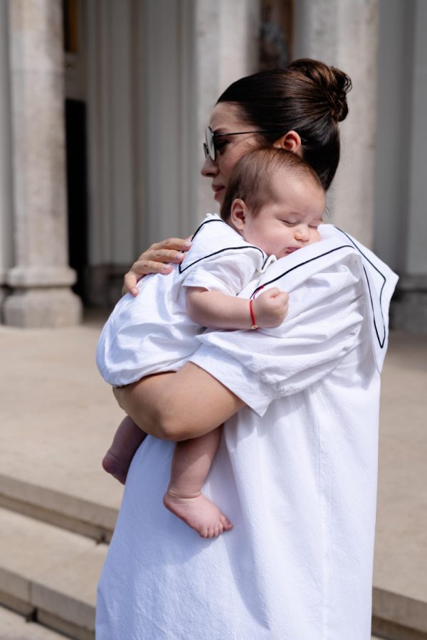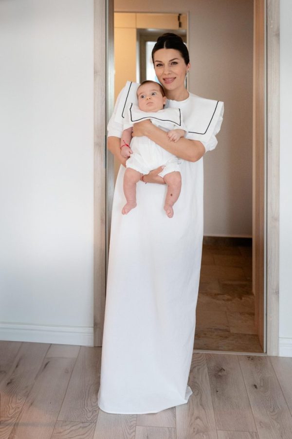 Salopeta Jhonny este realizata dintr-un bumbac alb cu guler patrat si lira neagra.