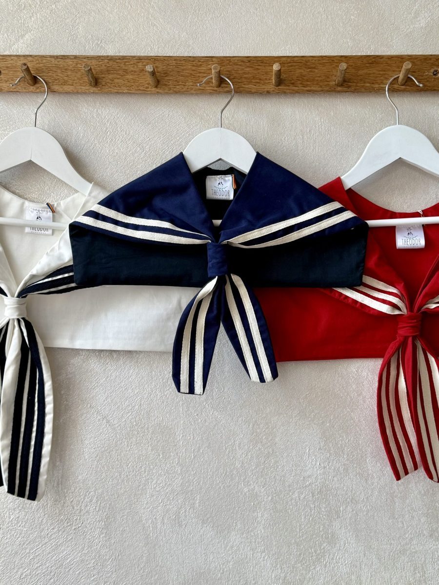 Salopeta Jhonny este realizata dintr-un bumbac alb cu guler patrat si lira neagra.