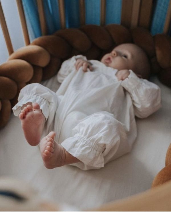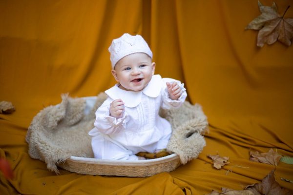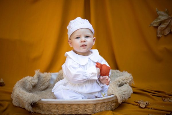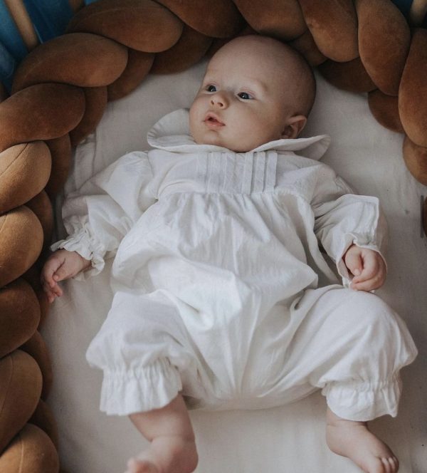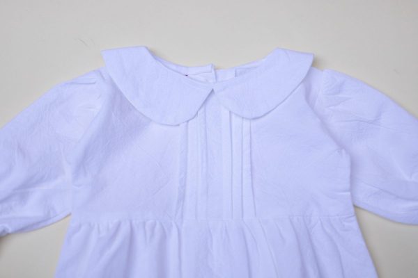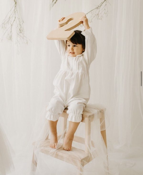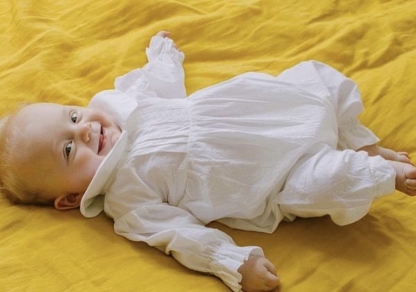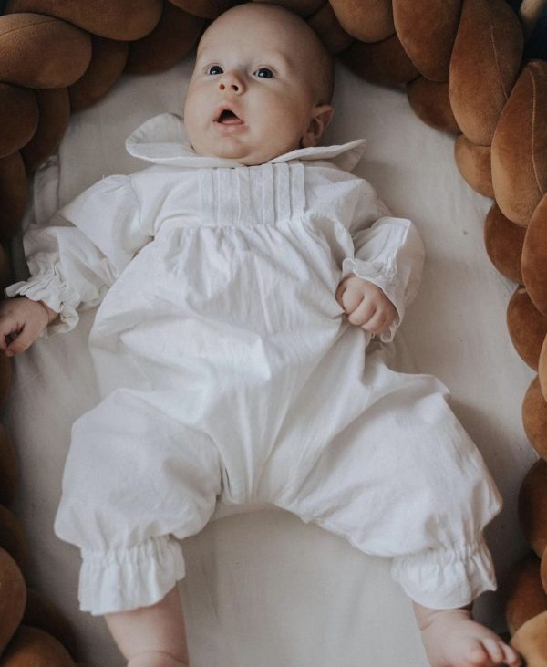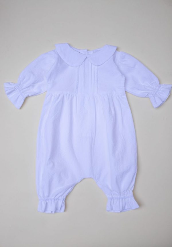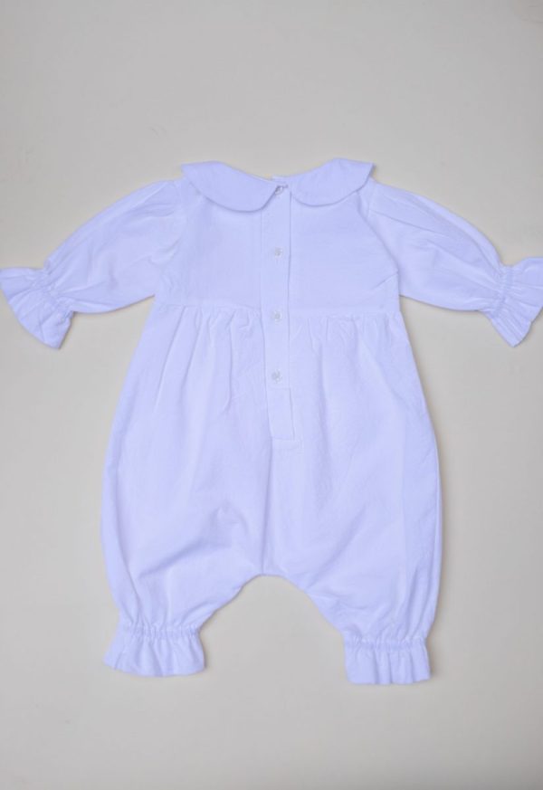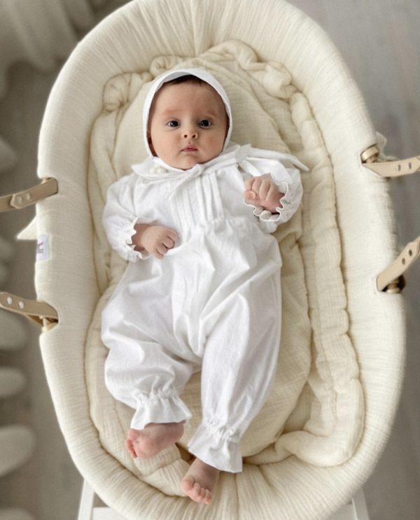 Salopeta Lea este un model unisex, ideala atat pentru fetite, cat si pentru baietei, realizata dintr-o panza topita, alba, plin, cu tuseu catifelat, tesuta in Romania, din bumbac natural.