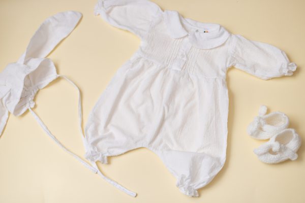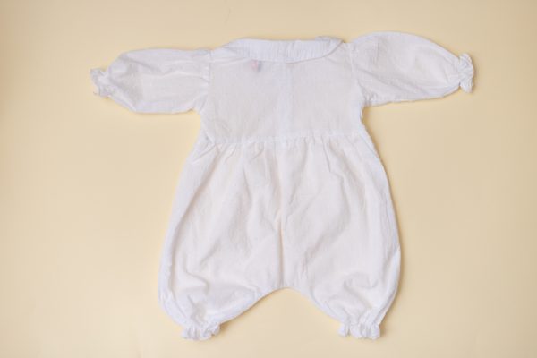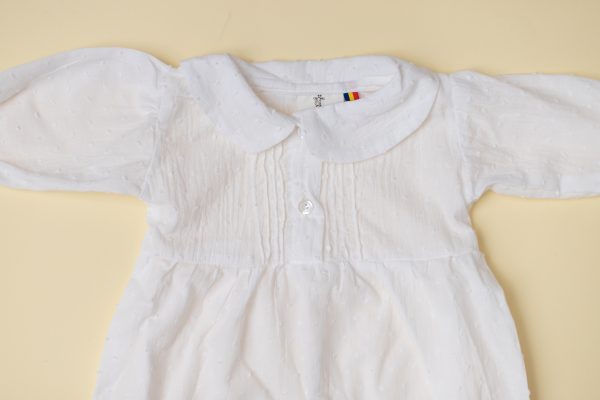 Salopeta Lu este realizata dintr-un bumbac alb, cu buline brodate, model unisex.