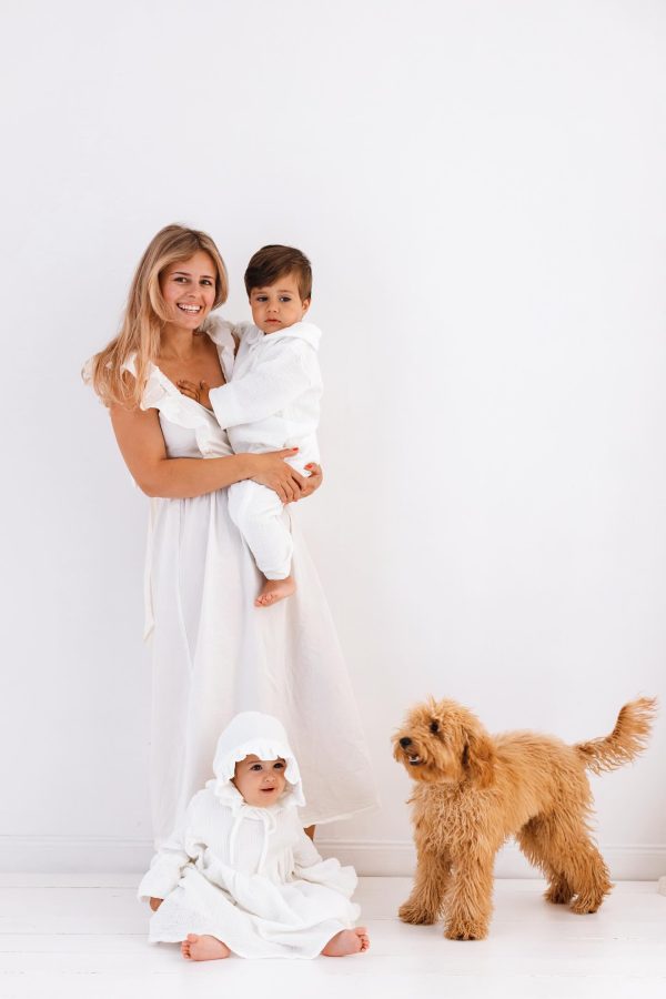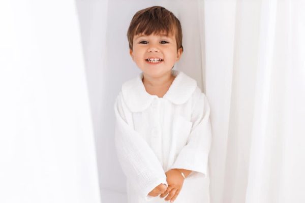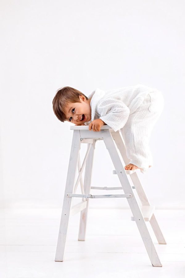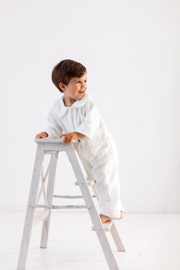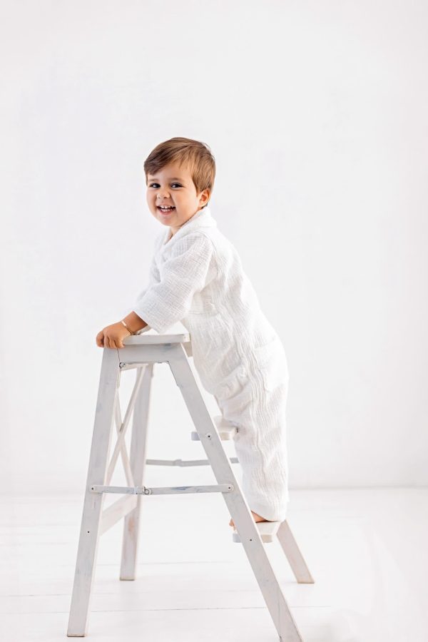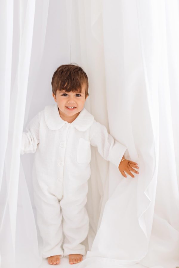 Salopeta din muselina alba este un model unisex, ideala atat pentru baietei, cat si pentru fetite.