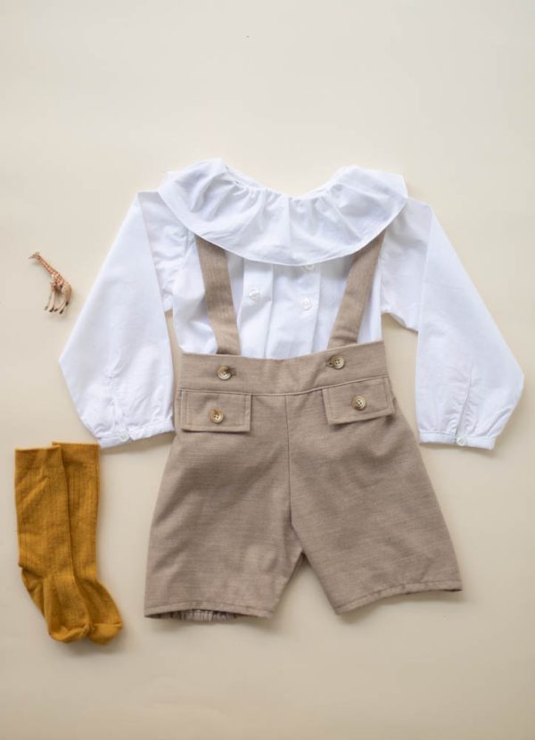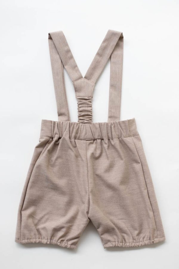 Salopeta Rachel este realizata dintr-o lana calitatea premium, bej, accesorizata cu doua clapete in partea din fata, are betelie fixa in fata si elastic lat la spate si bretele reglabile.