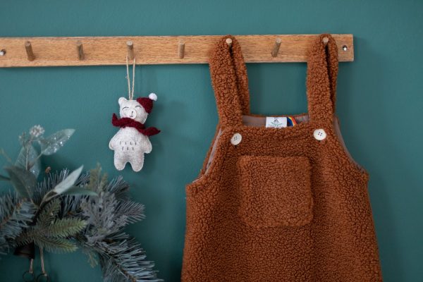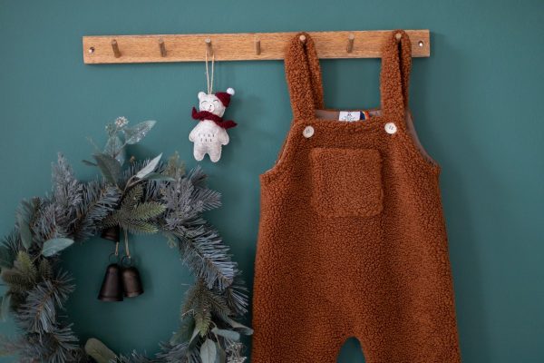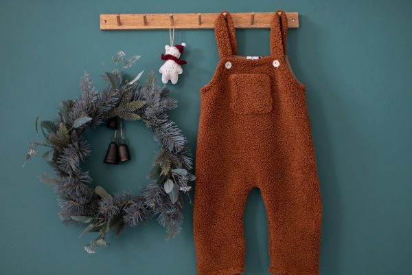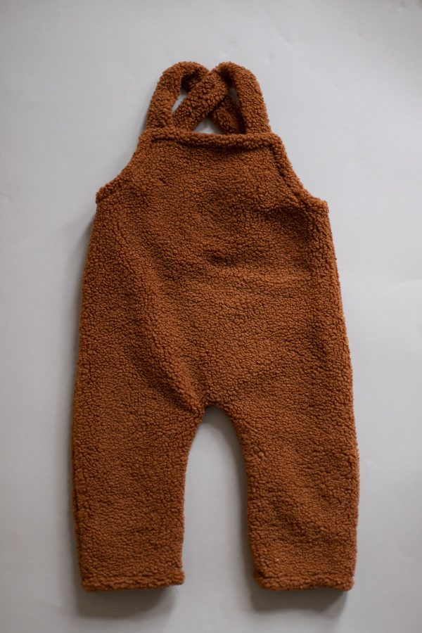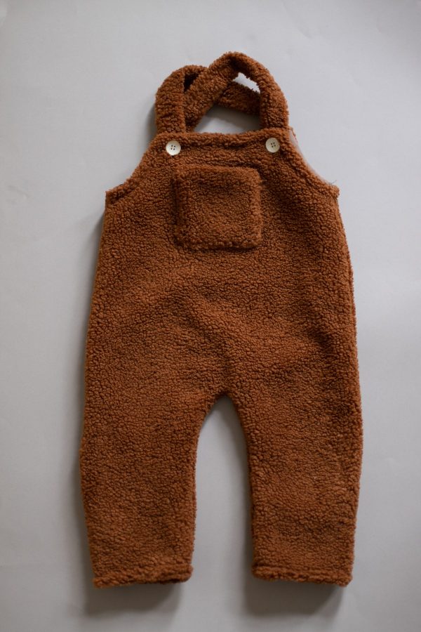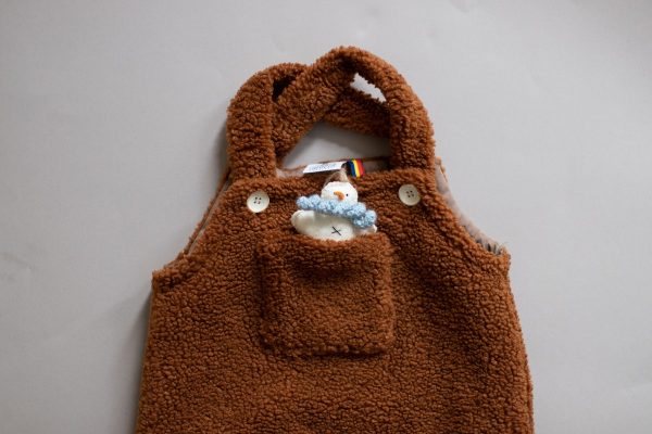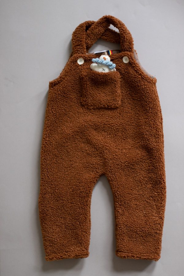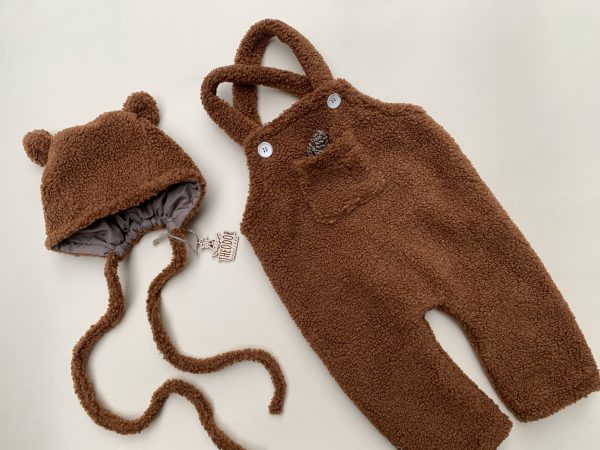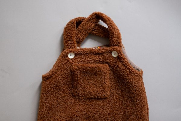 Salopeta Teddy este realizata dintr-o blanita maro, imitatie de oaie, captusita la interior cu bumbac natural.