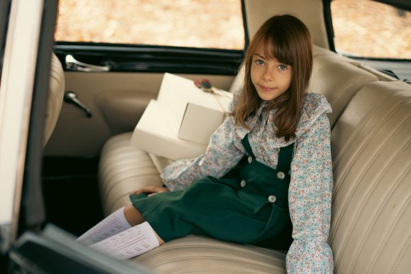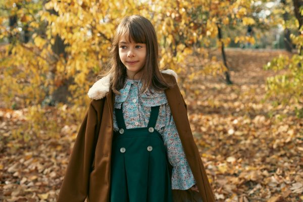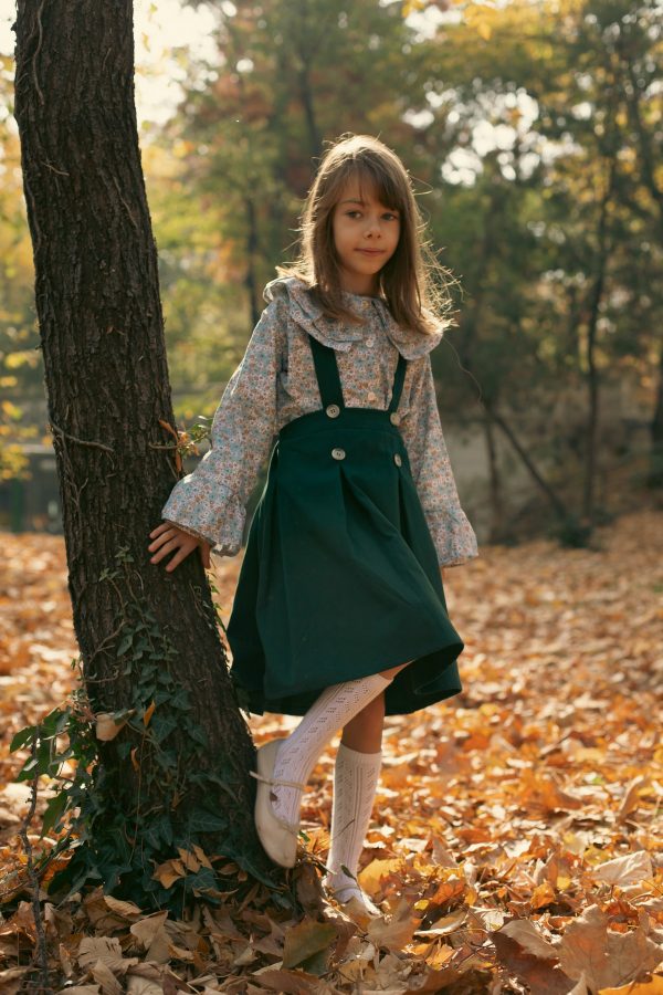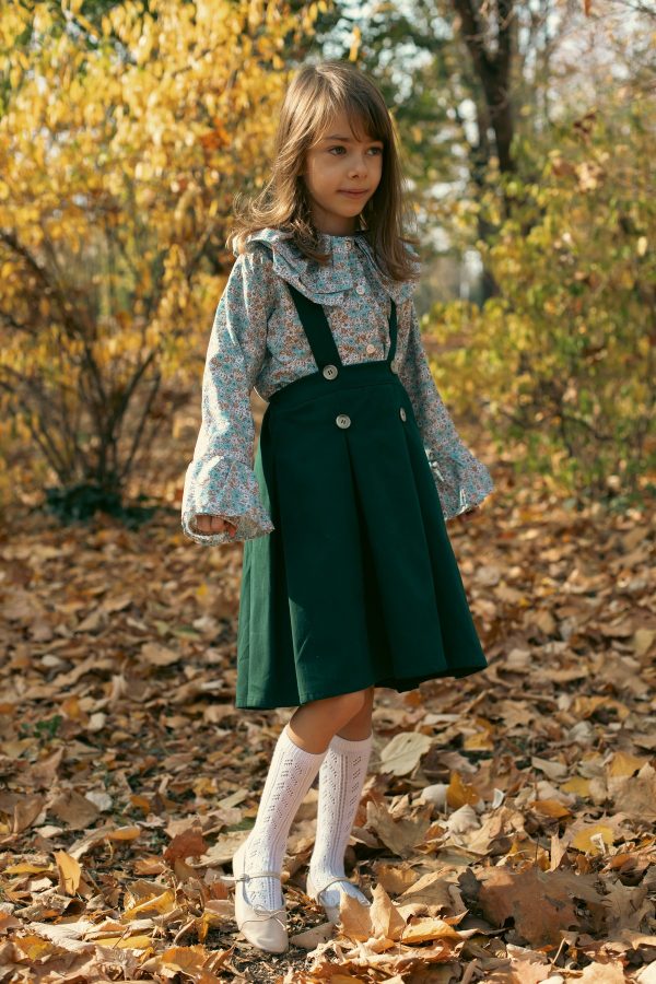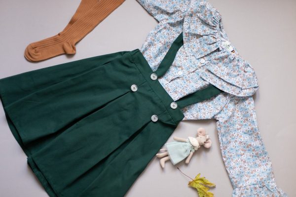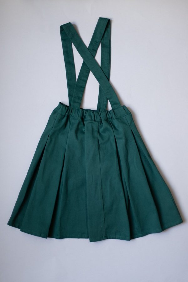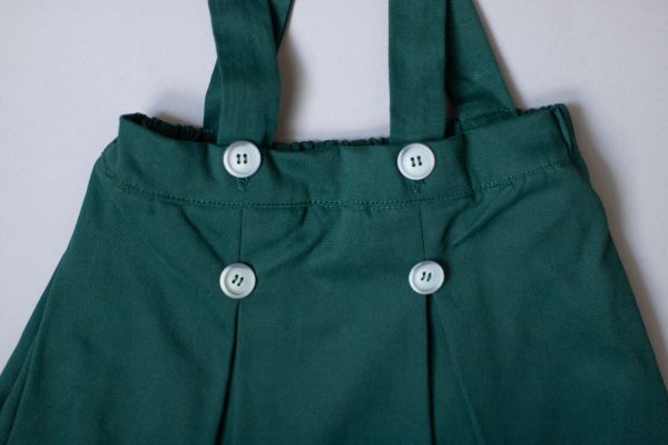 Sarafanul Lee este realizat dintr-un bumbac plin, verde inchis, cu pliuri si doua randuri de nasturi in partea din fata.