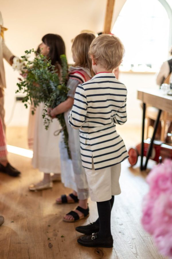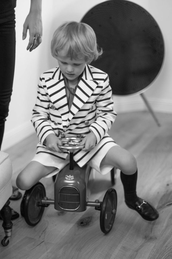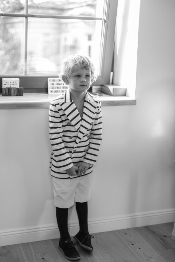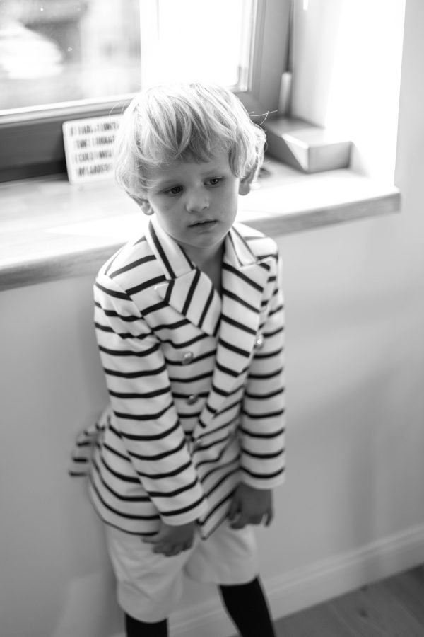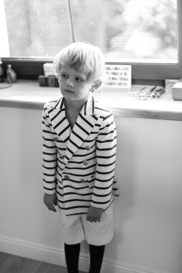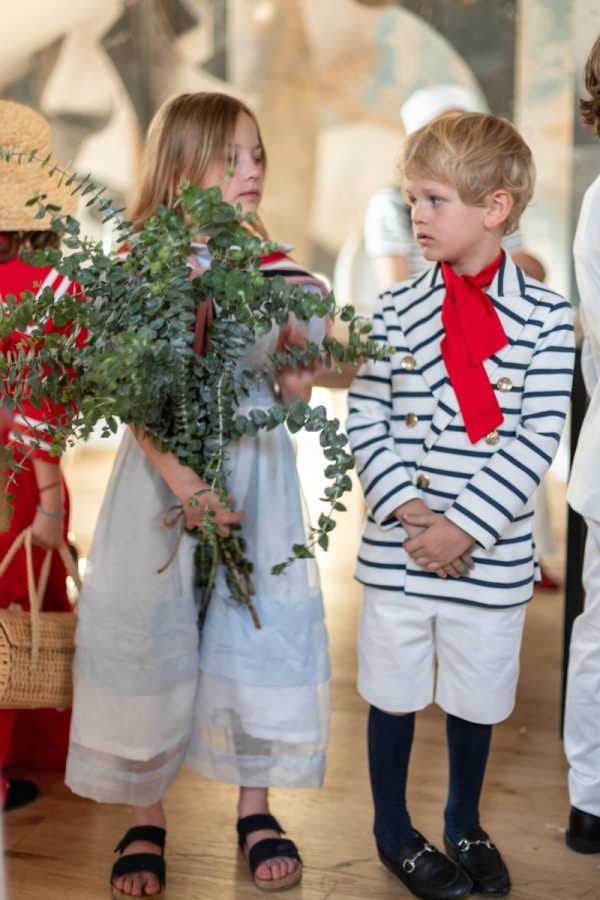 Tinuta Eden este formata din sacoul in dungi cu detalii aurii, sub semnatura lui Florin Dobre, pantalonul cu betelie lata si dunga pe mijloc, cu reglaj la spate si esarfa din bumbac rosu.