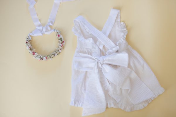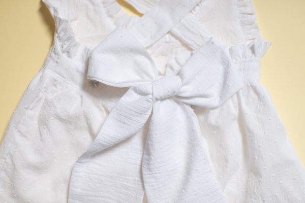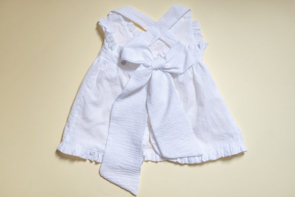 Topul Iris este realizat dintr-un bumbac alb cu buline brodate, este cu spatele gol si fundita la spate.