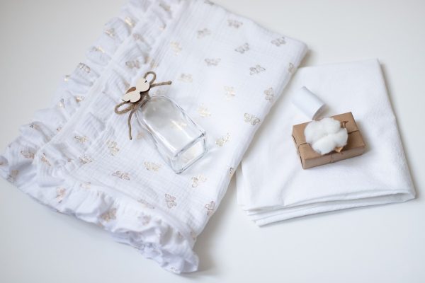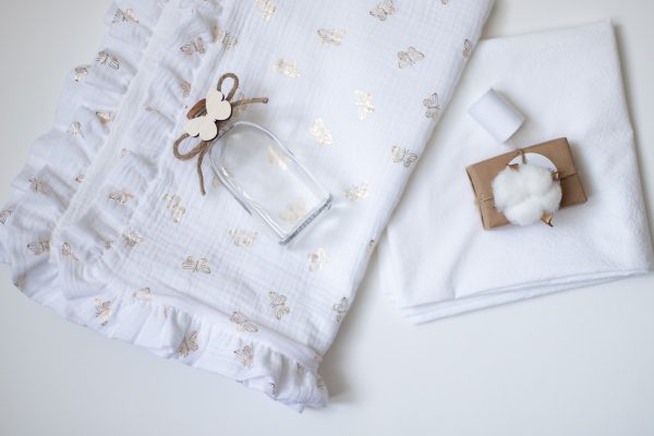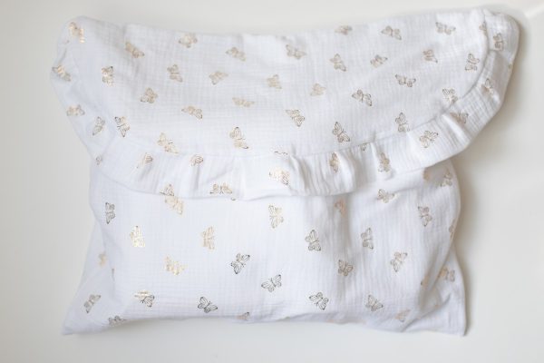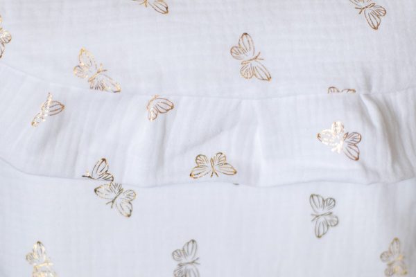 ~ saculet tip geanta cu volanas, din muselina cu imprimeu fluturi, bumbac natural 100%, inchidere in nasture