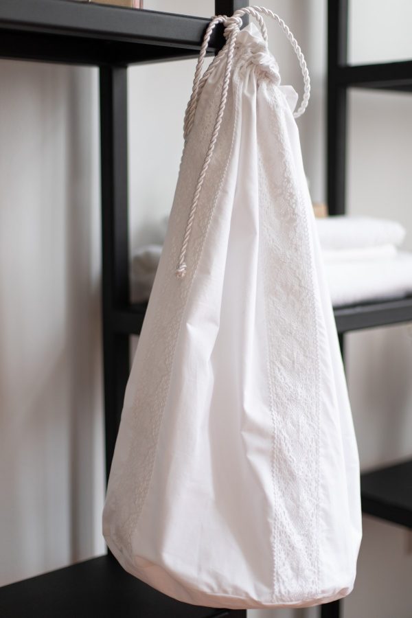 ~ saculet cu broderie ingusta, din bumbac natural alb, inchidere in snur